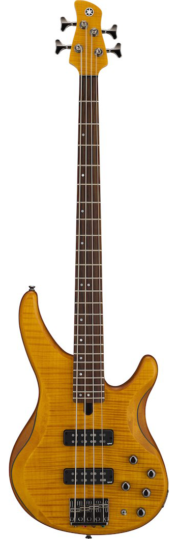 TRBX 300 Series, 500 Series and 600 Series instruments, all of which are available in both four-string and five-string configurations (click here for more information about the difference), are equipped with the same four-bolt neck joint as other Yamaha basses, but add a five-piece mahogany/maple neck, a high mass bridge, 3D sculpted bodies and two hum-cancelling pickups. The differences between the models come down to the choice of body woods (mahogany or flamed maple/alder) for tone and appearance, and the EQ circuits (EQ presets, two- or three-band EQ circuits, and/or active/passive switching).