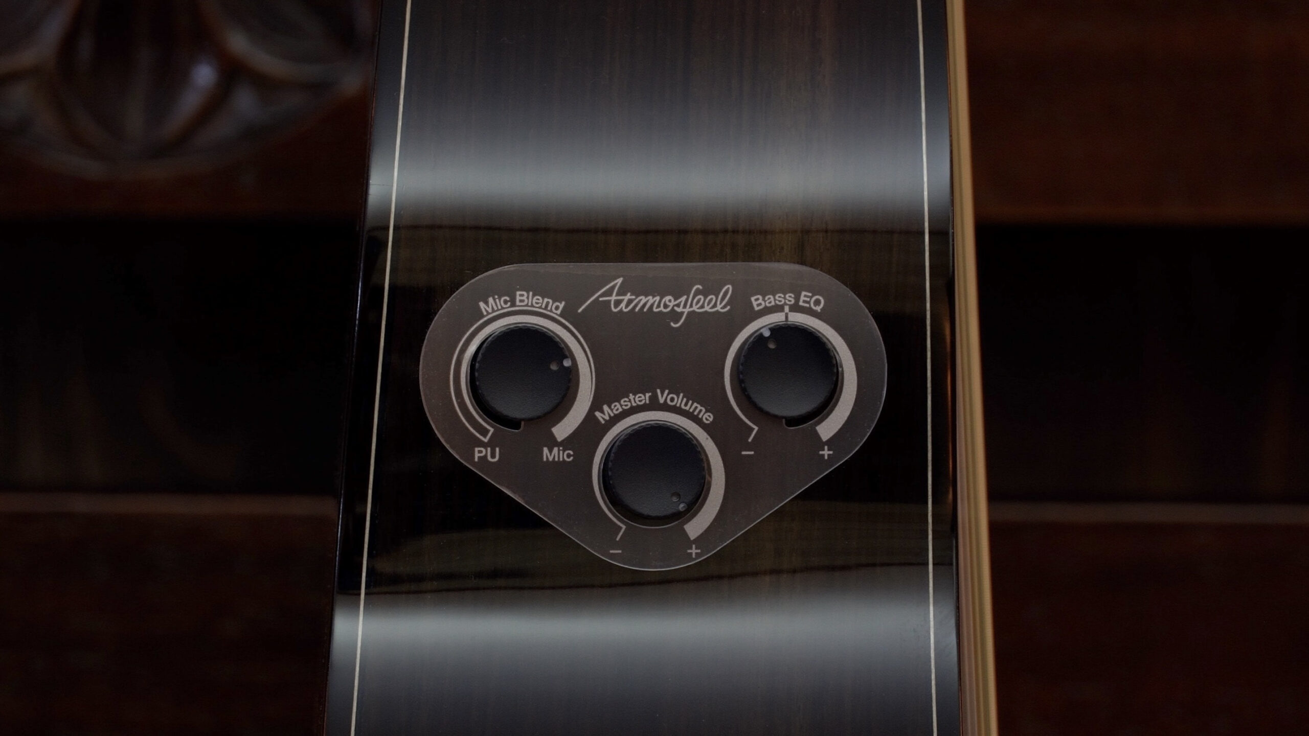 There are three Atmosfeel rotary dial controls, all located on the upper side of the guitar (facing the player). The first allows you to blend the microphone signal with the output of the two sensors. This way, you can choose to not engage the microphone at all, or to blend in as much microphone as you want.