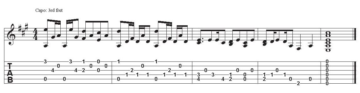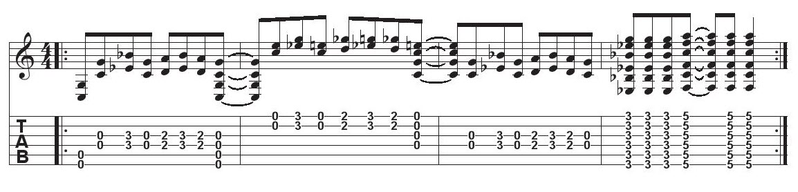 What’s the difference between tuning your guitar this way and playing in open A capoed up to the 3rd fret (as in the previous example)? You don’t have the same cross-string symmetry as before, but you do get a high E, which adds brightness to the guitar’s tone, and a low C, which balances out that brightness with extra heft. This is a particularly nice tuning for slide playing, and it also responds well when you throw in a little dissonance, as Jimmy Page learned when he used it on Led Zeppelin’s “Friends,” the inspiration for this example: