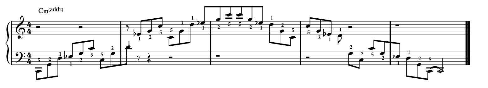 Arpeggios become much more interesting when you add some notes that go beyond the basic root, third and fifth of a triad. Here’s an example where the right hand swaps out the root for the second (a D) — a simple change that sounds very pleasing to the ear.