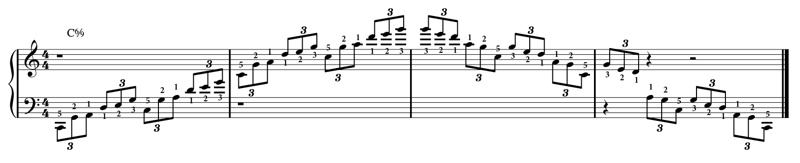 Now we’ll incorporate both triads into a two-handed arpeggio pattern, like this: