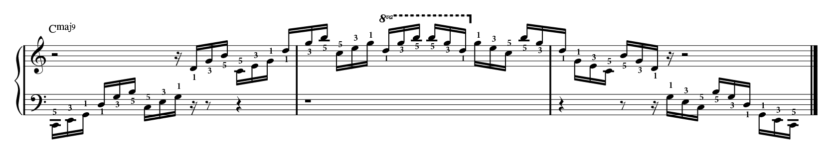 Lastly, you can combine complex chords to create very effective arpeggios. This example stacks a C dominant 7th chord in the left hand and an A Major triad in the right to create a very jazzy sound.
