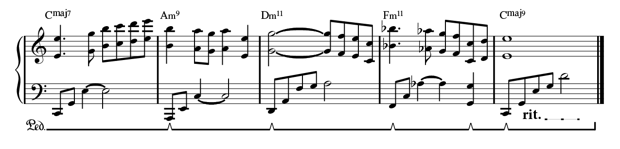 Octaves don’t only have to be used to add power. As shown in the example below, doubling a melody in octaves can also be done softly, in ballads and more down-tempo pop tunes. When played gently and in conjunction with the sustain pedal, it can be a very beautiful sound.
