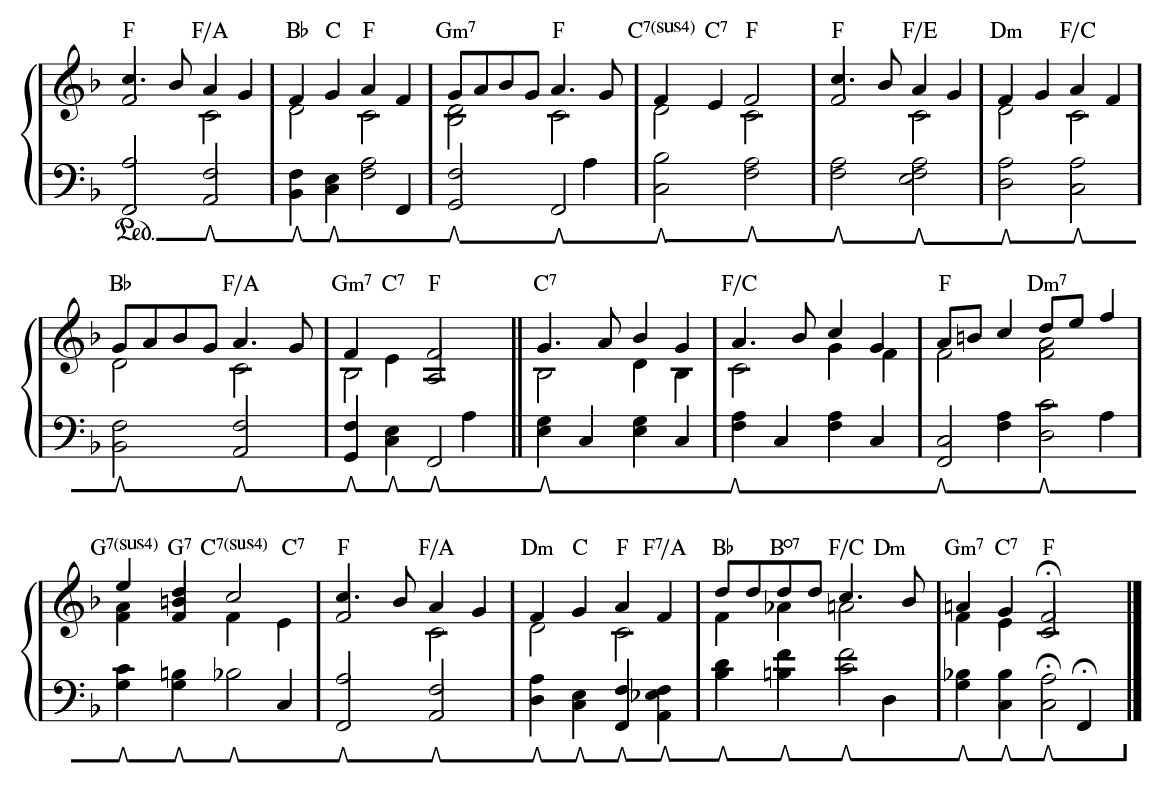 Now just fill in some of the missing notes, trying to play at least one additional note with each hand. Some pianists like to be strict and not double any notes between the hands, but there’s really no hard and fast rule here: simply spread the notes nicely across both hands so it sounds good to your ears. Here’s an example of how this can work, with added pedaling (indicated by the sustain/damper pedal markings in the notation) to demonstrate how everything can be made to sound connected:
