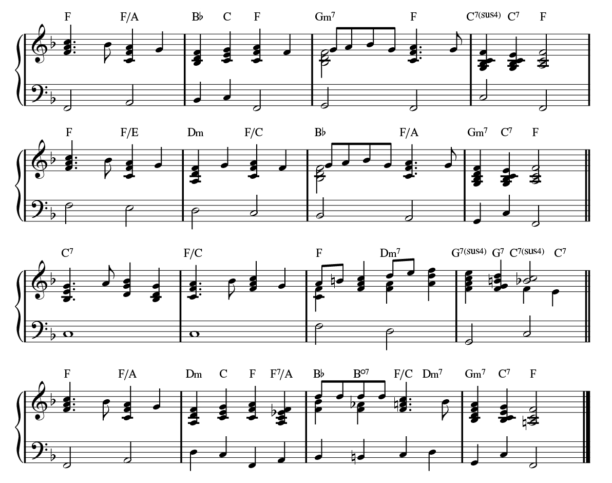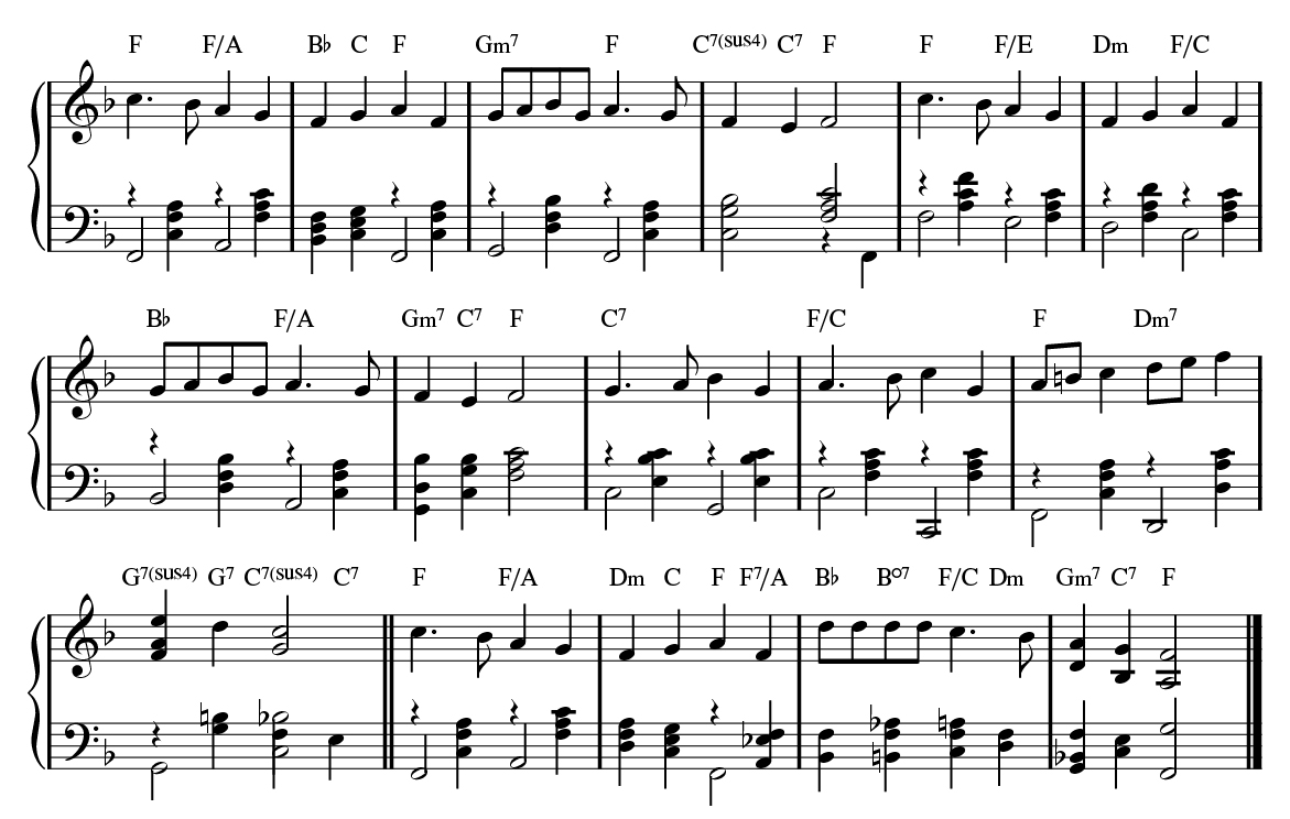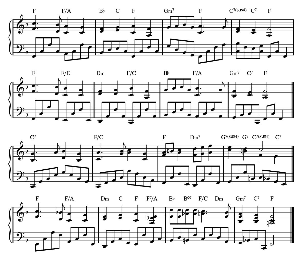 As you can see, only the melody is provided, along with chord symbols placed above the notes (lyrics are optional and may or may not be included). When first learning a song from a lead sheet, start by just playing the melody with your right hand and the root (the name of the chord, or the note presented after the slash mark) with your left hand, like this: