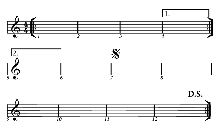 Here, you would play through both endings as usual, and then continue to the bar that has the D.S. instruction in it. From there, you’d jump back to wherever the D.S. sign is and then continue playing onward. The roadmap for this example would be: 1-2-3-4-1-2-3-5-6-7-8-9-10-11-12-7-8-9-10-11-12 and so on.