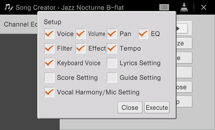 - Touch the display where you see the word “Setup” — notice all the choices that can be saved to the start of your MIDI file. Be sure Tempo is checked, then press “Execute”: