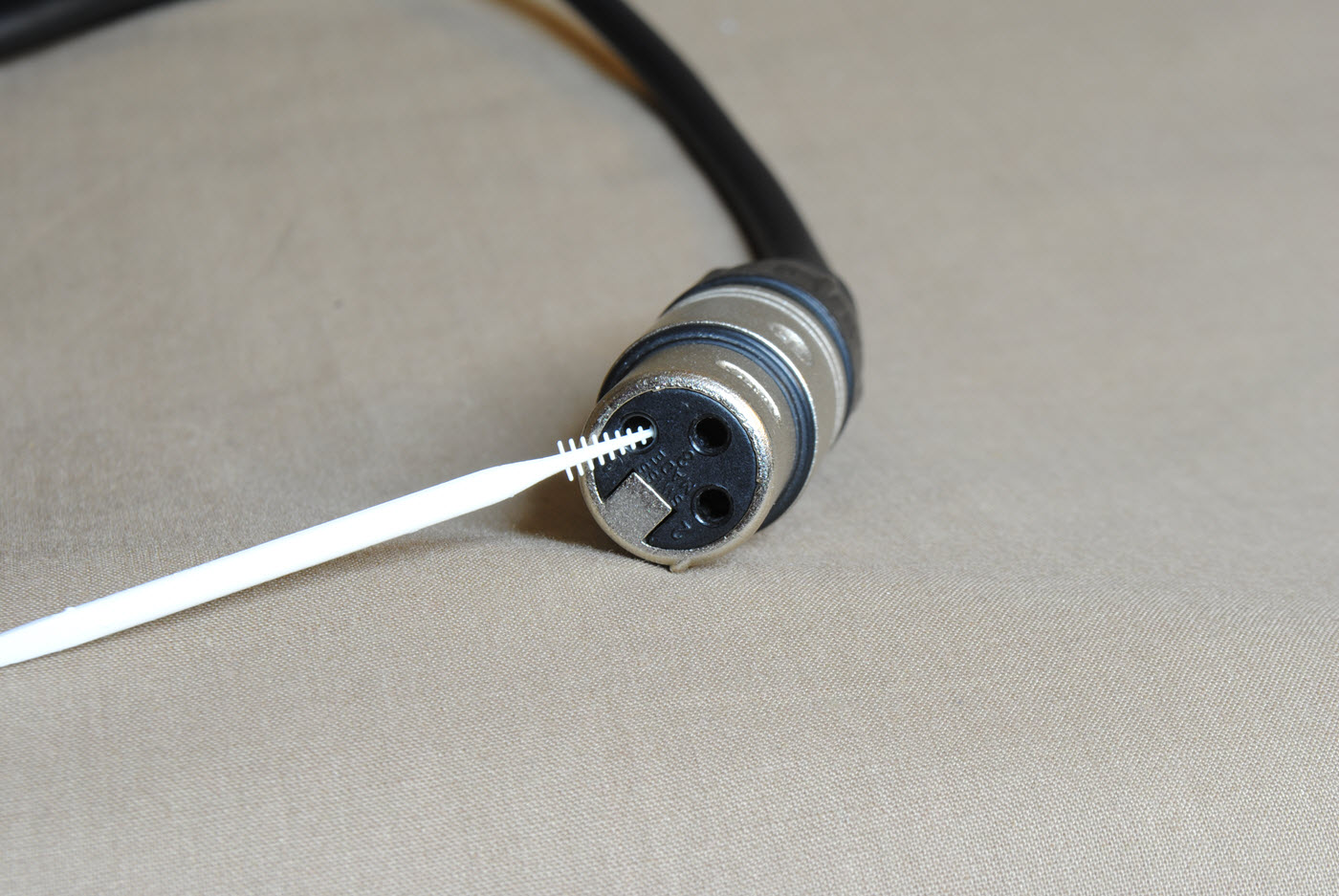 XLR connectors are a bit of a challenge to clean because the contacts are more difficult to access. A cotton swab with contact cleaner on it is helpful when cleaning the pins on a male XLR. Cleaning the sockets on a female XLR connector is tricky, but one effective method is to spray some contact cleaner into the sockets and use a plastic toothpick (the kind with the little brush on one end) to gently remove foreign matter, as shown in the illustration below. Don’t push anything larger into the sockets because that will spread the contacts and create an intermittent connection.