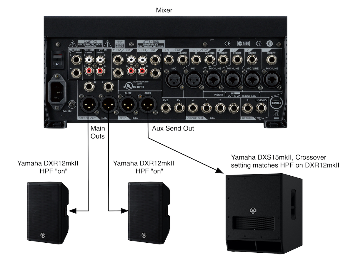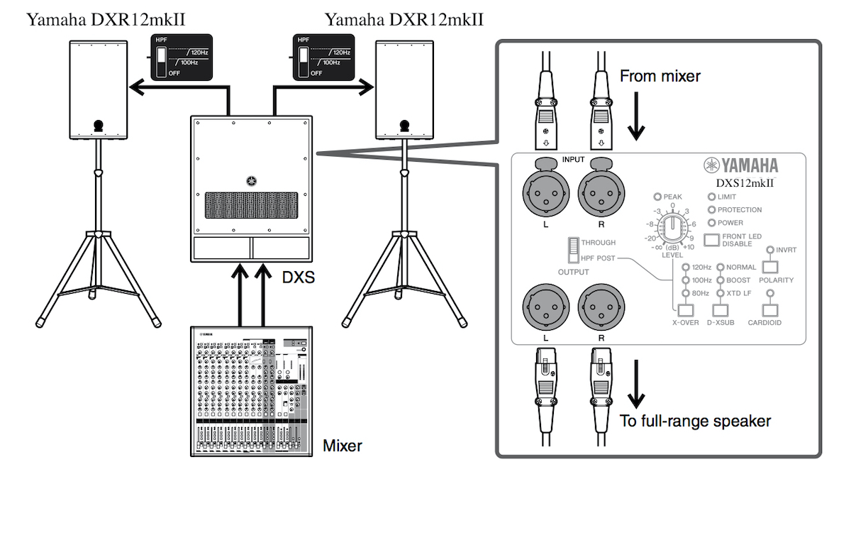 The interconnections for adding a subwoofer are usually pretty straightforward. Let’s suppose you have a pair of Yamaha DXR12mkII full-range loudspeakers and want to add a DXS subwoofer. As shown in the illustration below, simply connect the main left and right outputs from the mixer to the stereo inputs of the DXS subwoofer, then connect its stereo output jacks to the inputs of the two DXR12mkIIs. (The DXS output jacks can be used to connect full-range speakers or additional DXS subwoofers.)
