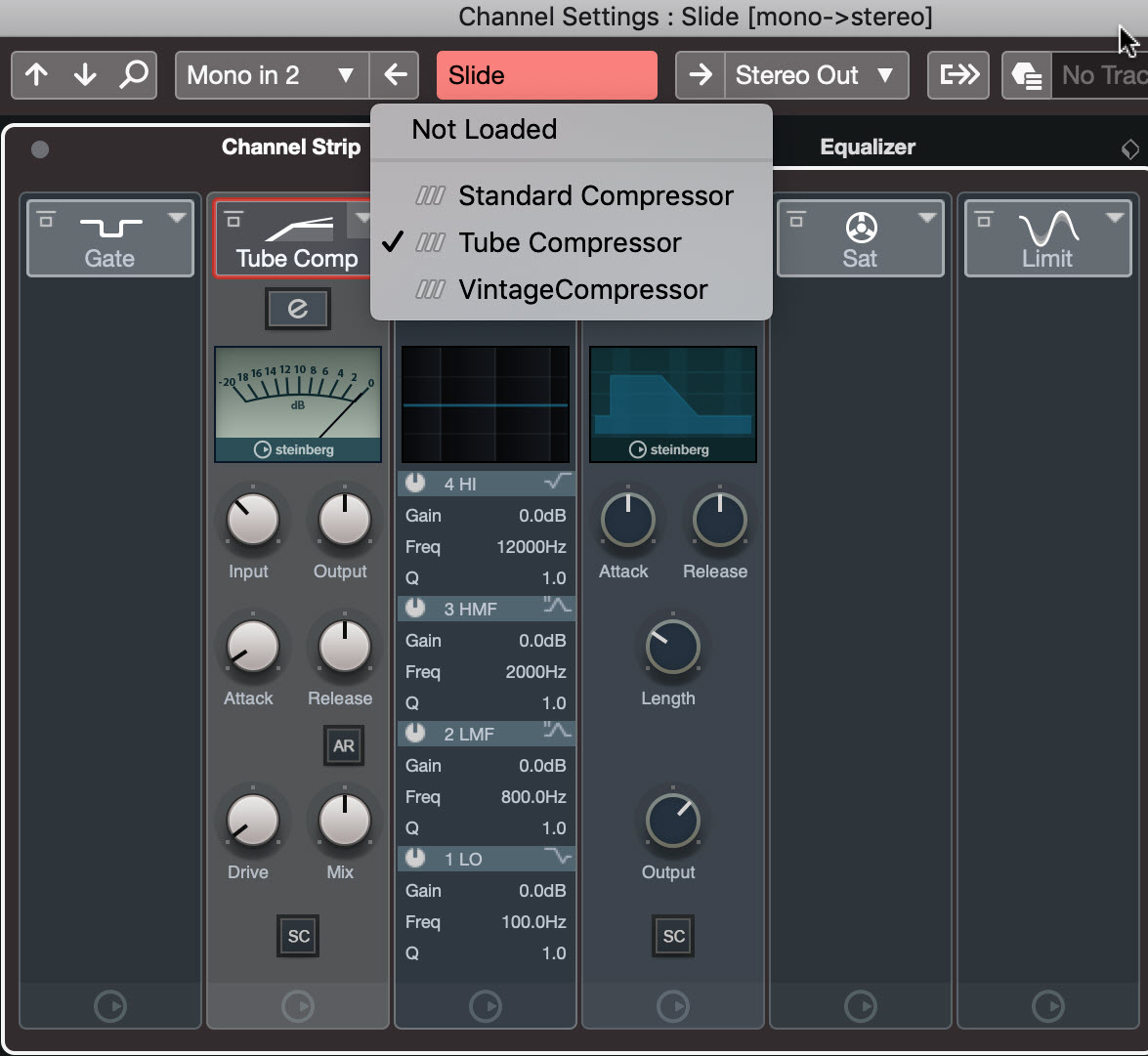 We’ll talk a little more about each of these shortly. Note that Cubase also offers several other individual compressor plug-ins that you can insert directly into the channel.